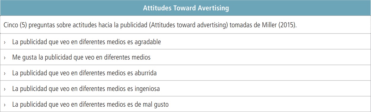 Siendo la publicidad el concepto del eje central del primer bloque del modelo planteado, se debe evaluar como la actitud de un individuo frente a la publicidad se ve afectada, siendo esto una respuesta al mensaje publicitario como lo indican Obermiller, Spangerberg y MacLachlan (2005). De otra parte, Kiousis (2001) indica que la actitud de un individuo se diferencia entre la actitud hacia el comunicador (la fuente emisora del mensaje) y la actitud hacia el canal (medios de comunicación tradicionales o digitales) (Kiousis, 2001). En tal sentido, se ha demostrado que la actitud de los individuos varía dependiendo del medio de comunicación por el cual se informan, un ejemplo de ello es presentado por Soh, Reid y King (2007) y Aydin (2013) quienes han demostrado que los medios impresos son más Tables que los medios no impresos o los medios digitales (Soh et al., 2007; Aydin, 2013). Así entonces surge la siguiente hipótesis del estudio, entre confianza en la publicidad y la actitud frente a la publicidad de la marca (H2: A mayor confianza en la publicidad tradicional / no tradicional, mejor actitud frente a la publicidad).