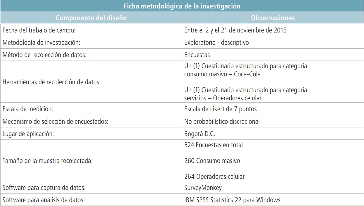 La presente investigación se desarrolló mediante un estudio exploratorio de tipo descriptivo, el cual se soportó en la adaptación de un cuestionario semi-estructurado con dos diferentes enfoques, el primero de ellos relacionado con productos de consumo masivo, en particular con la bebida gaseosa de la marca Coca-Cola y el segundo, relacionado con los servicios ofertados por los operadores de telefonía celular del país, considerando las tres (3) principales marcas de operadores Colombianos – Claro, Movistar y Tigo.
