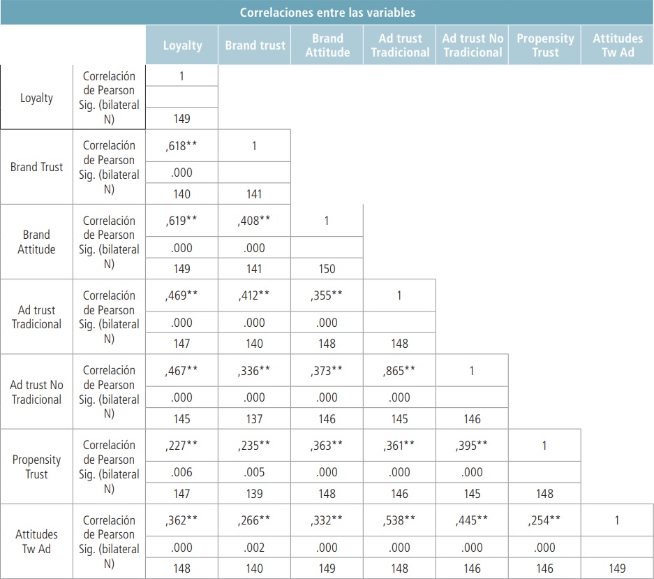 Los resultados de las correlaciones del primer bloque del modelo propuesto y para cada hipótesis, con sus respectivas significancias y valores P son las siguientes: H1: Propensión a confiar (PT) y confianza en la publicidad en medios tradicionales y no tradicionales (AD) .361 (valor p < 0,001) y .395 (valor p < 0,001) respectivamente. H2: Confianza en la publicidad (AD) y actitud frente a la misma (AA) .538 (valor p < 0,001) y .445 (valor p < 0,001) respectivamente. H3: ConTanza en la publicidad tradicional (AD-T) y confianza en la no tradicional (AD-NT) de .865 (valor p < 0,001).