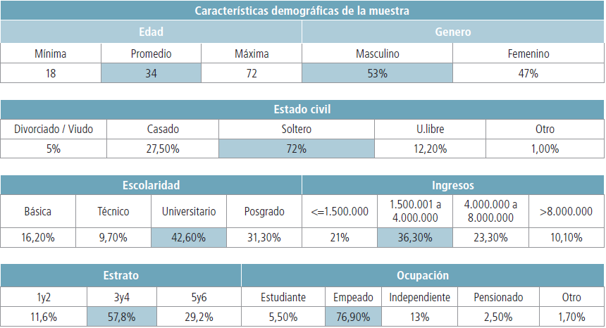 Los integrantes de la muestra fueron todos mayores de edad, con una participación promedio de 34 años. Se procuró una equidad de género logrando que el 53% de la muestra fueran hombres y el 47% mujeres. Respecto al estado civil se identificó que poco más del 47% de los encuestados, son solteros, 27,5% son casados y el 12% viven en unión libre. Sobre las condiciones laborales y de ingresos, se puede afirmar que en su gran mayoría son empleados (76,9%), y apenas un 13% son independientes, sus ingresos mensuales en pesos colombianos oscilan entre los 1,5 y los 4 millones de pesos en un 36,3% y entre más de 4 y hasta 8 millones en un (23,3%), con lo cual se garantiza que sean ellos mismos quienes cubren sus gastos personales de consumo.