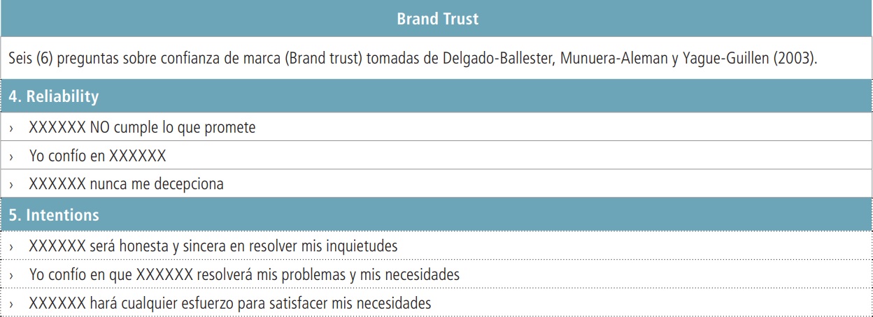 Delgado-Ballester, E., Munuera-Aleman, J. L., & Yague-Guillen, M. J. (2003). Development and validation of a brand trust scale. International Journal of Market Research, 45(1),p. 35-54.