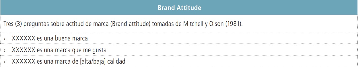 El punto focal del segundo bloque del modelo propuesto en la presente investigación es la lealtad de marca. Como mencionan Chaudhuri y Holbrook (2001), las marcas que logran hacer que sus clientes sean “alegres” y “afectivos” por ellas, tienden a lograr que éstos tengan mejor intención de compra, llamándolo lealtad actitudinal, así mismo, Dick y Basu (1994) explican que dada una mejor actitud por parte de un cliente frente a la marca, mayor será su lealtad a la misma. En tal sentido, la actitud hacia la marca es una función de las creencias hacia la misma y los aspectos evaluativos de estas creencias (Fishbein, 1975), factores que finalmente se ven reflejados en las intenciones favorable de compra. Frente a estos conceptos, se plantea la relación entre la actitud frente a la marca y la lealtad hacia la misma (H4: Entre mejor sea la actitud frente a la marca, mayor intención de compra existirá).