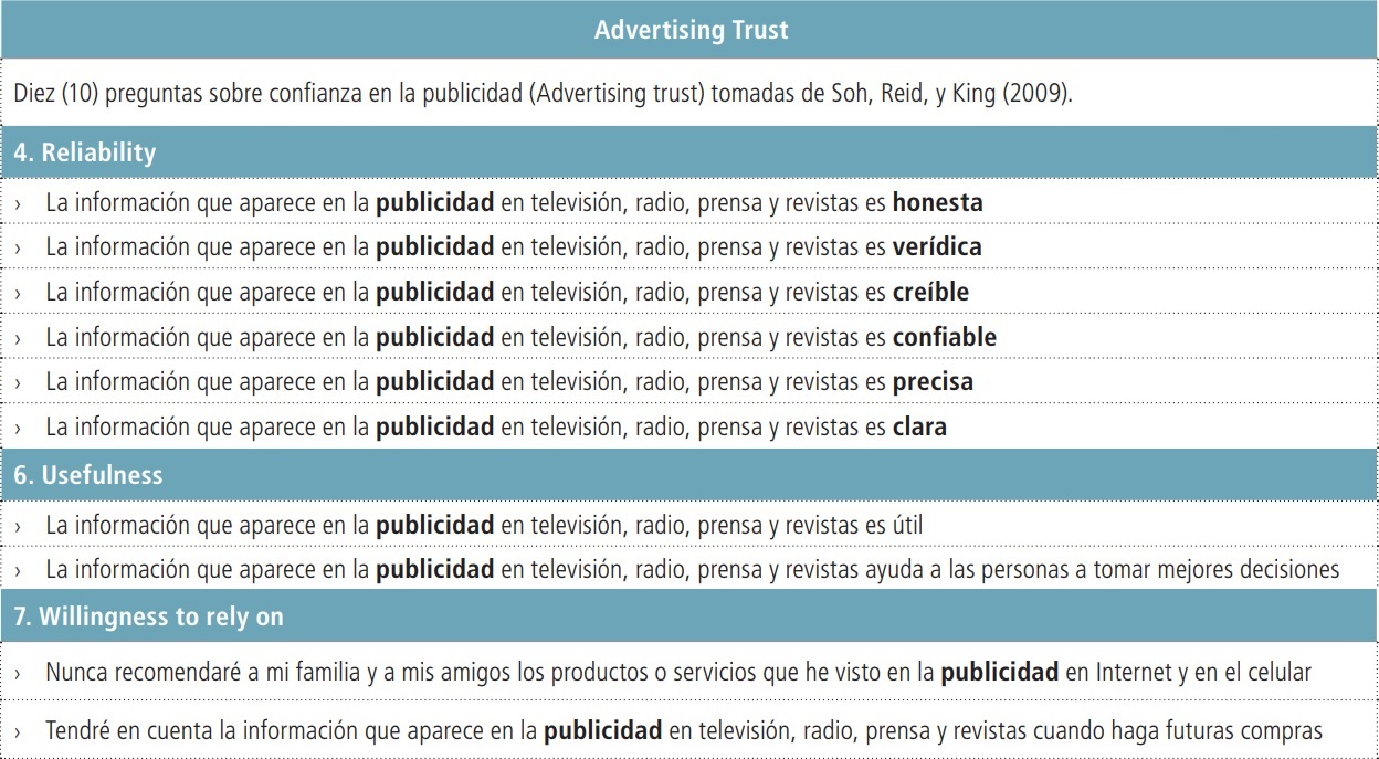 La confianza en la publicidad ha sido tema de estudio y engloba constructos como la persuasión, la aceptación de la información dependiendo del medio que la transmite y la confianza como eje clave en la relación venta-consumo (Soh, Reid y King, 2007). De estos constructos el más destacado es el de persuasión, que la RAE describe como el hecho de “Inducir, mover u obligar a alguien con razones a creer o hacer algo”. Su relación con la publicidad es explicada por Aydin (2013), de la siguiente manera: el objetivo principal de la publicidad es el de persuadir a los consumidores de la manera en que el anunciante pretende. Soh, Reid y Whitehill (2007) entienden que la confianza en la publicidad en general puede incrementar la probabilidad de que el producto publicitado sea recibido como Table, así mismo, como explican Li y Miniar (2006) muchos anunciantes toman provecho de la ventaja de usar apelaciones a la confianza en sus piezas publicitarias ya que proveen a los consumidores de distintas bases para que infieran positivamente sobre el producto y la marca. Aquellas marcas confiadas por los consumidores, pueden y deben poder cumplir sus funciones y deben ser percibidas como benevolentes al acompañar positivamente a sus clientes en sus necesidades y ofrecer soluciones a las mismas, así como, estar dispuestas a brindarles una respuesta oportuna (Fournier, 1998; Larzelere y Huston, 1980).