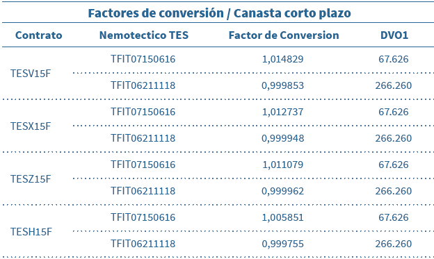 La BVC determinó que la negociación de este derivado tendría tres contratos: corto, mediano y largo plazo, resaltando que cada uno estaría compuesto por una canasta que refleja las referencias de TES existentes para dichos periodos. Es así como, (I) en la canasta de corto plazo se encuentran las referencias con vencimiento hasta 2 años, (II) en la de mediano plazo se encuentran aquellas referencias líquidas hasta con vencimiento en 5 años y (III) en la de largo plazo se cobijan las referencias de TES líquidas restantes.
