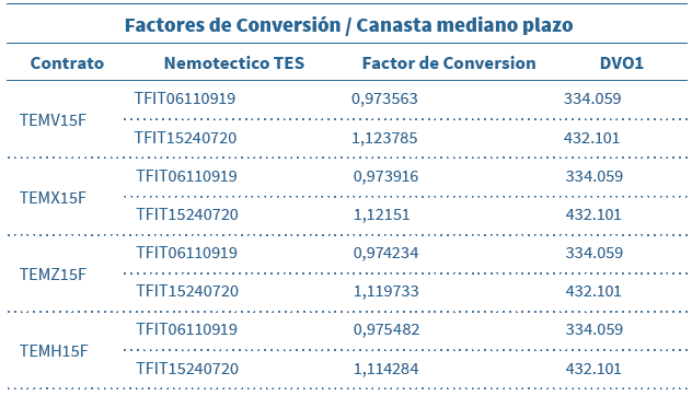 La estructura de negociación del Futuro de Bono Nocional establece que, a pesar de negociarse una canasta con varias referencias de TES entregables, al vencimiento del contrato el título que se entrega a la contraparte compradora del derivado, es el Cheapest to Deliver. Es así como, las condiciones actuales del mercado señalan para cada canasta las siguientes referencias: Ver tabla 15.