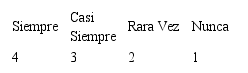 INSTRUCCIONES: Conteste este cuestionario consignando una equis (X) en el casillero de su preferencia. Utilice la siguiente escala de valoración (Tabla 8):