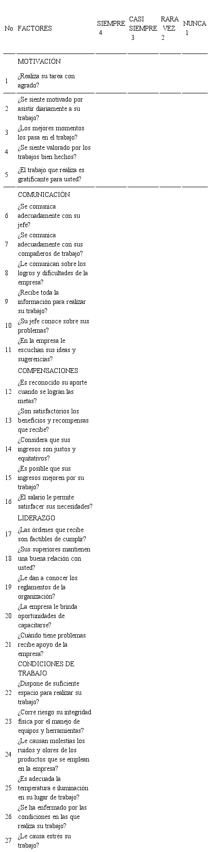 Para obtener la información, se aplicó un cuestionario estructurado en 27 ítems, con cuatro alternativas de respuesta (4: siempre, 3: casi siempre, 2: rara vez y 1: nunca) en la escala de Likert. (Véase anexo 1). Los cuestionarios fueron contestados de forma confidencial y anónima. Este instrumento fue validado por cuatro expertos: dos en psicología industrial y dos directores de talento humano. Para medir el tiempo de aplicación y la efectividad del instrumento, se realizó una prueba piloto, que consistió en administrar el instrumento a una pequeña muestra para probar su pertinencia y relevancia (Hernández et al., 2010), en una de las empresas asociadas a la CALTU.