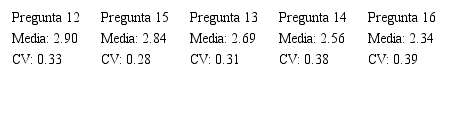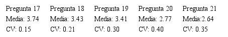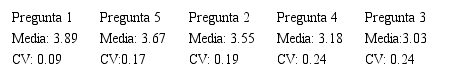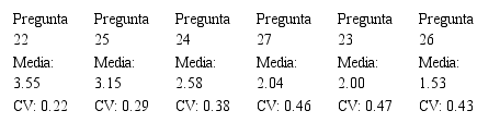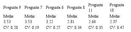 Es necesario aclarar que, se realizó el cálculo del Coeficiente de Variación de cada factor y pregunta por no tener puntuaciones brutas, pues al tener puntuaciones continuas, no se pueden calcular puntuaciones Z; consecuentemente el índice más aconsejable, es el coeficiente de variación para poder comparar entre los factores. (Camarero, 2013). Es importante recordar que las distribuciones con un coeficiente de Variación (CV) menor a 1, son considerados de baja variación, mientras que los coeficientes de variación mayores a 1, son considerados de alta variación (Ratios, 2014). Aunque es recomendable, no generalizar estos rangos de variación, es preferible analizarlos de una manera específica y propia de cada investigación, considerando el tipo de investigación realizado. (Camarero, 2013)