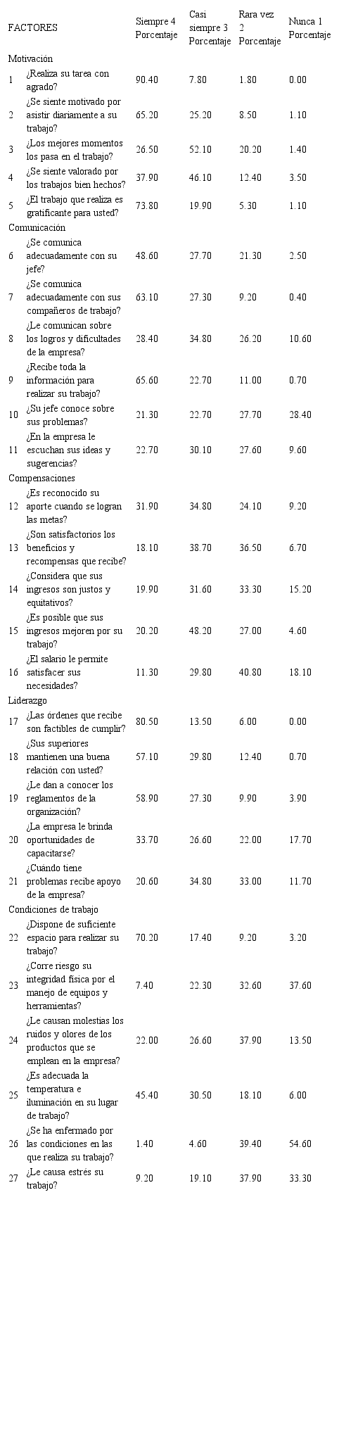 Como se puede ver, en las preguntas correspondientes al factor Motivación en la tabla 7, la pregunta 1 indica que, la mayoría de los encuestados (90.4%) realizan sus tareas con agrado, es decir, los encuestados se sienten motivados para la realización de las tareas. Llama la atención, que, según los datos recopilados, no hay encuestados que realicen las tareas con total desagrado, hay un porcentaje de respuestas del 0% a la opción nunca. Se observa también que, si bien es alto el nivel de agrado en la realización de las tareas, no es una sensación diaria que los encuestados la tienen en la ejecución de las tareas; esto se interpreta, por los porcentajes contestados a la pregunta 2 con las opciones siempre (65.20%) y casi siempre (25.20%). En la pregunta 5, se observa que los encuestados en un gran porcentaje (73.80%) sienten el trabajo gratificante, es decir, las tareas les motivan. Un análisis global de este factor, nos indica que existe una alta motivación en los empleados para la realización de las tareas, perciben como muy gratificante el trabajo, están motivados para asistir al trabajo; aunque no siempre se sienten valorados por la realización del trabajo, ni siempre pasan los mejores momentos en el puesto de trabajo.