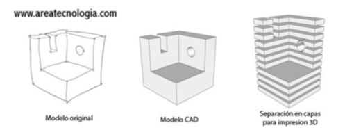 La fabricación aditiva (AM) o las impresoras 3D, lo que hacen es crear un objeto con sus 3 dimensiones, y esto se consigue construyendo capas sucesivamente hasta conseguir el objeto deseado. Ver figura 2.