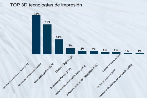 El término Impresión 3D, abarca una amplia gama de impresión tecnológica, que aplica a diferentes enfoques. Pero, de acuerdo con una encuesta del año 2016, se muestra en la figura 4, que se utilizan principalmente tres tecnologías, las cuales son: la sinterización selectiva por láser; modelado por deposición fundida; y, la estereolitografía.