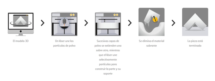 Una de las principales ventajas, que presenta sobre las demás tecnologías de fabricación aditiva, es que el lecho de polvo actúa como soporte de la pieza que se está fabricando, por lo que el diseño adicional de estructuras de soporte es innecesario, aligerando la carga de diseño y el esfuerzo de la extracción de la pieza sustancialmente. (Acevedo, 2016). Ver figuras 5 y 6.