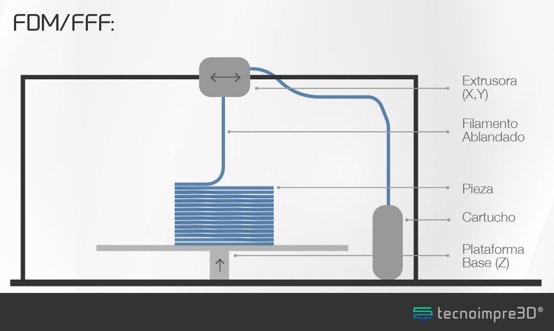 Ahora bien, el Modelado por deposición fundida (FDM): es la tecnología de impresión más adoptada y fácil de usar 3D y es la más familiar para los consumidores. Las impresoras FDM, utilizan material de alimentación endurecido (por lo general plástico en una bobina), que luego se introduce en la impresora y se funde capa por capa para producir el objeto final. Ver figura 7.