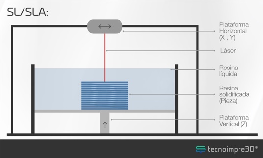 Estereolitografía (SLA): utiliza un rayo láser que se mueve para construir el objeto, capa por capa, de un polímero líquido que se endurece en contacto con la luz del láser. SLA está bien establecido para las aplicaciones de prototipado rápido. (Heutger, & Kückelhaus, 2016). Ver figura 8.