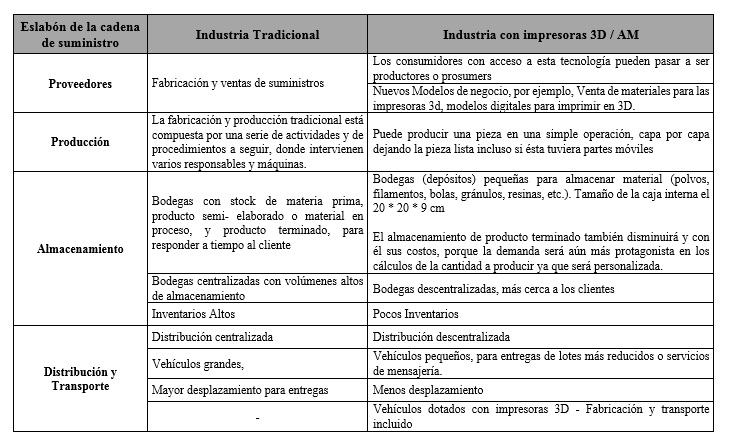 A continuación, la tabla 4, muestra una comparación general de cada uno de los eslabones de la cadena de suministro, entre la Industria Tradicional que se realiza actualmente vs la Industria con la inclusión de la tecnología de las impresoras 3D.