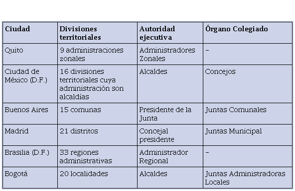 En relación con las autoridades que les corresponden todas cuentan con una autoridad ejecutiva, pero solo en dos de los casos (Quito y Brasilia) esta es nombrada por el alcalde de la ciudad, en las otras ciudades (Buenos Aires, Madrid y Ciudad de México) es una autoridad de elección popular, lo cual le otorga mayores grados de autonomía a estas autoridades para el ejercicio de sus funciones (Ver Tabla 2). Además, a excepción de Quito y Brasilia, las demás cuentan con un órgano colegiado, cuyos miembros son elegidos mediante el voto de los ciudadanos, con lo que se garantiza la representación ciudadana en los procesos de decisión interna. Finalmente, no en todos los casos es posible identificar funciones claras para estas unidades administrativas como sucede en los casos de Quito y Brasilia, donde no se describen funciones en las normas principales, igual que en el caso de las localidades de Bogotá limitando con ello el cumplimiento de los propósitos descritos para estas unidades administrativas en materia de provisión de bienes y servicios públicos.
