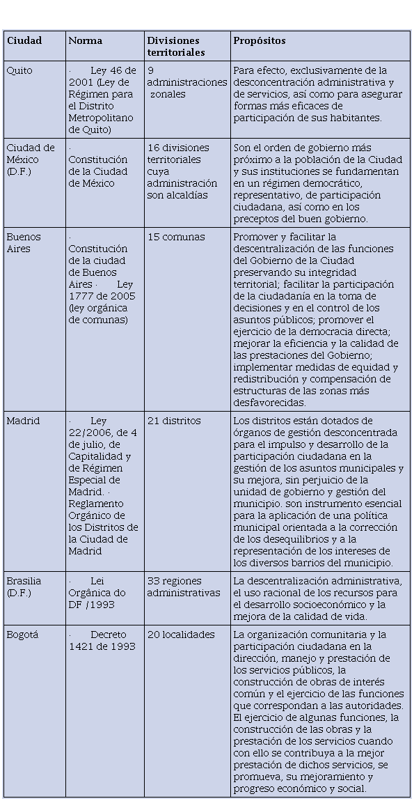 Debido a la importancia que han adquirido durante las últimas décadas los procesos de democratización, la gobernabilidad y el mejoramiento constante de la gestión estatal a nivel urbano, este documento está orientado a analizar la forma como se han estructurado algunas ciudades grandes en divisiones administrativas al interior de su territorio, y en especial la forma como se encuentra organizada la ciudad de Bogotá para llevar a cabo estos propósitos, a saber, mediante las localidades. En el proceso, se identificaron las similitudes y diferencias existentes entre la estructura propia de Bogotá y otras ciudades capitales como Quito, Ciudad de México, Buenos Aires, Brasilia y Madrid. Mediante una revisión normativa y bibliográfica se pudo conocer la forma como las unidades administrativas territoriales de estas ciudades se insertan dentro la estructura general de la entidad, así como la descripción propia que les corresponde en materia de autoridades y responsabilidades. En términos generales se pudo demostrar que, aunque las normas generales establecidas para Bogotá buscaron equipararlas a modelos similares a los que identifican a ciudades como Buenos Aires, Ciudad de México y Madrid en materia de su rol en la gestión y la promoción de la autonomía local, en la práctica los desarrollos normativos posteriores profundizaron su lógica de unidades desconcentradas similar a como están diseñadas otras ciudades, como son los casos de Brasilia y Quito.