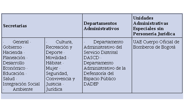 Debido a que los organismos que forman parte del Sector Central de las entidades territoriales en Colombia no tienen personería jurídica, los mismos también responden a la lógica de unidades administrativas, sobre las cuales opera la figura de la desconcentración administrativa. Para el caso de la ciudad, el sector central se compone de 18 entidades entre las que se encuentran 15 secretarías, 2 departamentos administrativos y 1 unidad administrativa especial sin personería jurídica (Ver Tabla 3). En este marco, las alcaldías locales son unidades desconcentradas de uno de estos organismos, que a su vez es desconcentrado, debido a que forma parte del Sector Central del Distrito.