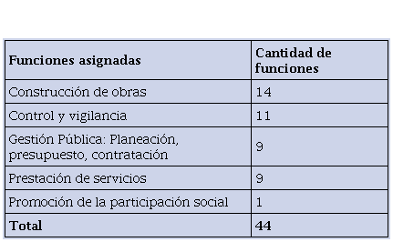En el caso de Bogotá también es posible identificar un énfasis en el desarrollo normativo de la ciudad a centrar su atención en los alcaldes locales en lugar de las Localidades, pero a diferencia de Brasilia, los alcaldes locales sí tienen asignadas funciones de naturaleza sectorial, pero que en estricta lógica deberían haberse reconocido a la unidad administrativa. De acuerdo con la revisión realizada a las normas centrales que les asignaron funciones (Decreto Distrital 1421 de 1993, Decreto Distrital 854 de 2001, Decreto Distrital 101 de 2010, Acuerdo Distrital 740 de 2019, Manual de funciones y competencias laborales de la Secretaría Distrital de Gobierno), se encontró que a estas autoridades se les han asignado un total de 44 funciones, entre las que hay funciones de Gestión Pública, Control y vigilancia, Inversión Social, Construcción de obras y Promoción de la Participación Social. De estos temas, el mayor número de responsabilidades se ubica en los temas de Construcción de Obras y en los de Control y Vigilancia, y en menor número están las funciones relativas a la Promoción de la Participación Social (ver Tabla 4).