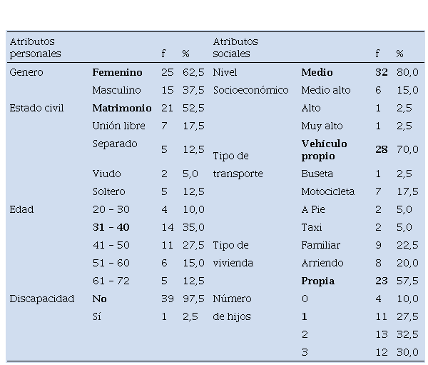 Para poder determinar el perfil sociodemográfico del administrador de propiedad horizontal de los conjuntos cerrados de la ciudad de Villavicencio, se dividen las variables en atributos personales como lo son: género, estado civil, edad y presencia de alguna discapacidad. Luego se tomaron los atributos sociales: nivel socioeconómico, tipo de transporte, tipo de vivienda y número de hijos (ver Tabla 1). Dentro de los resultados se encuentra que en los administradores de propiedad horizontal en Villavicencio predomina el género femenino (62,5 %), las personas con estado civil de casado (52,5 %) y con una edad promedio de 31 a 40 años (35 %), Como dato final en esta variable se pudo obtener que entre todos los encuestados solo una persona presenta algún tipo de discapacidad.