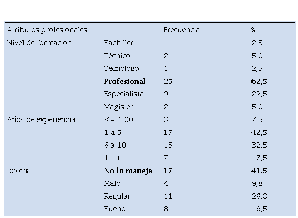 Más tarde se tomaron los atributos profesionales como nivel de formación, años de experiencia e idioma, para analizar una frecuencia en los datos obtenidos. Dentro de la población estudiada, el mayor porcentaje son profesionales (62,2 %), lo cual es indispensable para el logro y desarrollo de todas las funciones que conlleva un cargo administrativo. En cuanto a la experiencia se destaca el rango de uno a cinco años (42,5 %), y en lo referente al manejo de un segundo idioma es medianamente significativo (41,5 %).