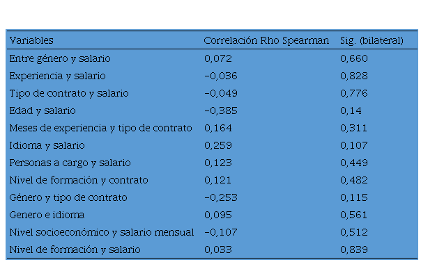 Por medio de la prueba de chi-cuadrado de Pearson, el nivel y el coeficiente de significancia se puede evidenciar que las variables de importancia tenidas en cuenta en este estudio tienen relación con la habilidad. Sin embargo, al realizar pruebas de correlación, no se encontraron correlaciones entre las distintas variables (ver Tabla 3). Esto refleja la existencia de un grupo de población muy diverso, lo que podría obedecer a la no existencia de un programa formal de educación que aporte al desarrollo de la profesión.
