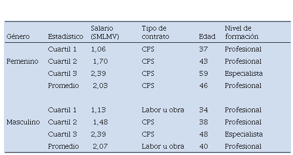 Se encuentra, además, sobre las compensaciones y la forma de vinculación, que ninguna de las variables tiene relación; en la dispersión y tendencia de género en promedio se evidencia que por un margen muy corto los hombres devengan un poco más que las mujeres, y en cuanto al tipo de contrato, para las mujeres prima el CPS y para los hombres el de labor u obra. La diferencia en edad entre ambos géneros es de 6 años, dado que las mujeres presentan mayor edad (46). Finalmente se observa que los dos tipos de género tienen un nivel de formación de tipo profesional.