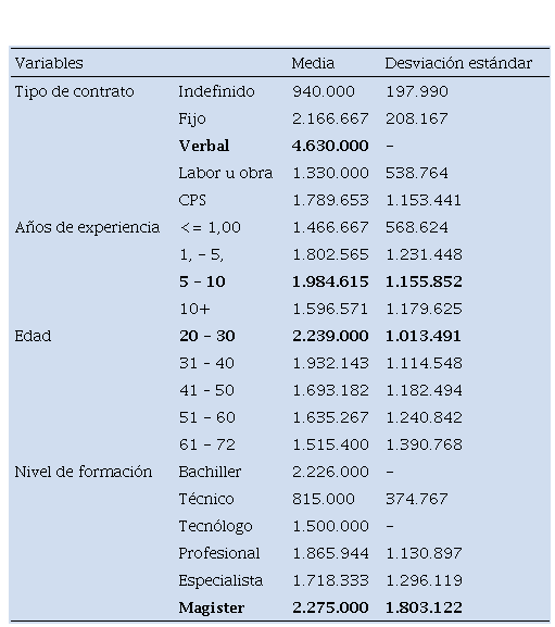 Se tomaron algunas variables en determinación al salario, mostrando que el tipo de contrato que se utiliza es el verbal y tiene un promedio de $4´630.000, en cuanto a los años de experiencia los profesionales que cuentan con 5 a 10 años de experiencia poseen un salario de $1’984.615, las personas con edades entre 20 y 30 años un promedio de $2.239.000 y el nivel de formación que más devengan es el magíster con $2.275.000.