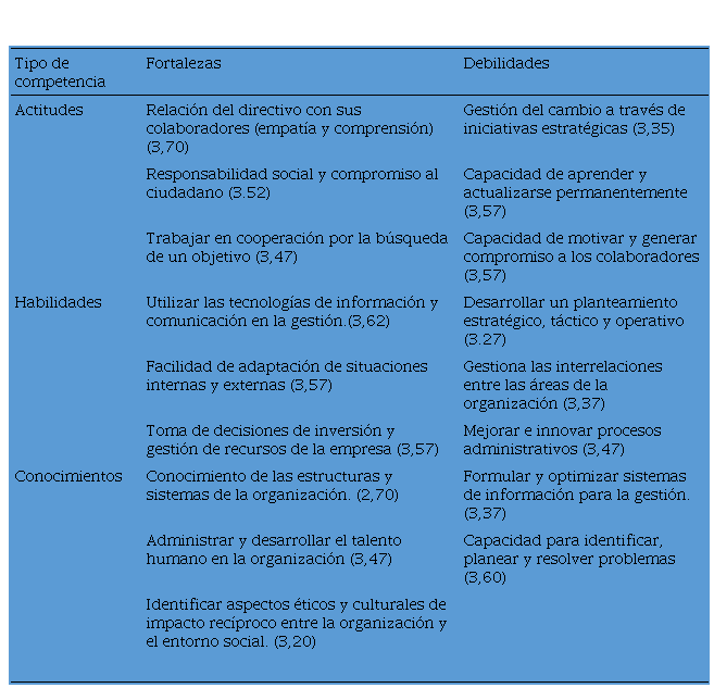 Por su parte, en las habilidades se encuentran como fortalezas el uso de tecnologías de información y comunicación en la gestión y la facilidad de adaptación a situaciones internas y externas, y como debilidades el desarrollo de un planteamiento estratégico, táctico y operativo; la gestión de interrelaciones entre las áreas de la organización y la mejora e innovación de procesos administrativos