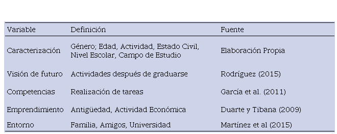 El Global Entrepreneurship Survey Student´S Spirit (GUESSS) es un proyecto global que pretende identificar el espíritu emprendedor universitario. Para lo anterior, el proyecto suministra el instrumento de recolección de la información previamente validado. Para el presente artículo se extrajeron las variables mostradas en la tabla 1, y como resultados se incluyen la caracterización de la población objeto del estudio, la relación que existe entre el emprendimiento y su entorno, las competencias a desarrollar y su estado actual, y por último la visión de ese estudiante frente a un futuro en el emprendimiento.