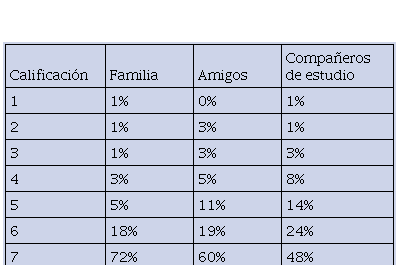 Otro aspecto interesante en el emprendedor es el apoyo con que puede contar en su entorno. En el caso de esta investigación, se analizó a la familia, a los amigos y a los compañeros de estudio, además, se invitó a los participantes a calificar de 1 a 7 el apoyo de cada uno de estos componentes de su entorno, teniendo a 1 como la calificación menor y 7 la mayor, siendo en cada caso 7 la calificación con mayor peso con resultados del 72%, 60% y 48% respectivamente, siendo el componente de compañeros de estudio el de menor resultado. Se puede afirmar, en consecuencia, que la institución no ofrece un entorno que promueva el espíritu emprendedor (tabla 5).