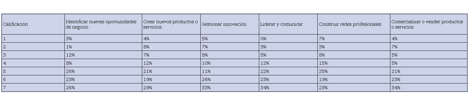 Para evaluar el grado de competencia en cada actividad se usó una escala del 1 al 7, teniendo al 1 como calificación mínima y al 7 como la máxima. Como resultado se puede observar la calificación baja dada a cada una de las actividades, la media de la calificación 7 de las 6 actividades, solo llega al 30%; sumado a la generación del entorno emprendedor en la institución, la formación debe generar la potenciación de competencias como las evaluadas en la presente investigación. La Tabla 6 muestra los porcentajes obtenidos por cada calificación, en cada actividad.