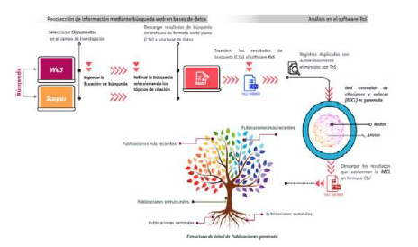 En la etapa 2 se realizó un análisis de jerarquía bibliográfica mediante el software de libre acceso ToS, basada en una red extendida de citaciones y enlaces entre citaciones creada por Tree of Science (ToS). Esta etapa se encuentra representada en la Figura 1. En esta etapa de la investigación la información en formato CSV extraída de la búsqueda en la etapa 1 fue cargada en el software ToS, como se describió en Agudelo y Agudelo Aguirre (2023). La información obtenida de la red extendida de citaciones permitió la conformación en una estructura similar a un árbol de las publicaciones con mayor relevancia dentro de cada una de las categorías seminal, estructural y reciente, de acuerdo con la jerarquización de las publicaciones en términos de citaciones. Por un lado, aquellas publicaciones que han sido citadas por otras publicaciones en la red extendida, pero a su vez no han citado a otras publicaciones en esta red, son clasificadas como de carácter seminal. Por otro lado, las publicaciones que han citado publicaciones seminales y a su vez han sido citadas por las publicaciones más recientes de la red fueron denominadas estructurales. Finalmente, las publicaciones que han citado a otras publicaciones dentro de la red y a su vez presentan escazas o nulas citaciones por otras publicaciones fueron denominadas recientes.
