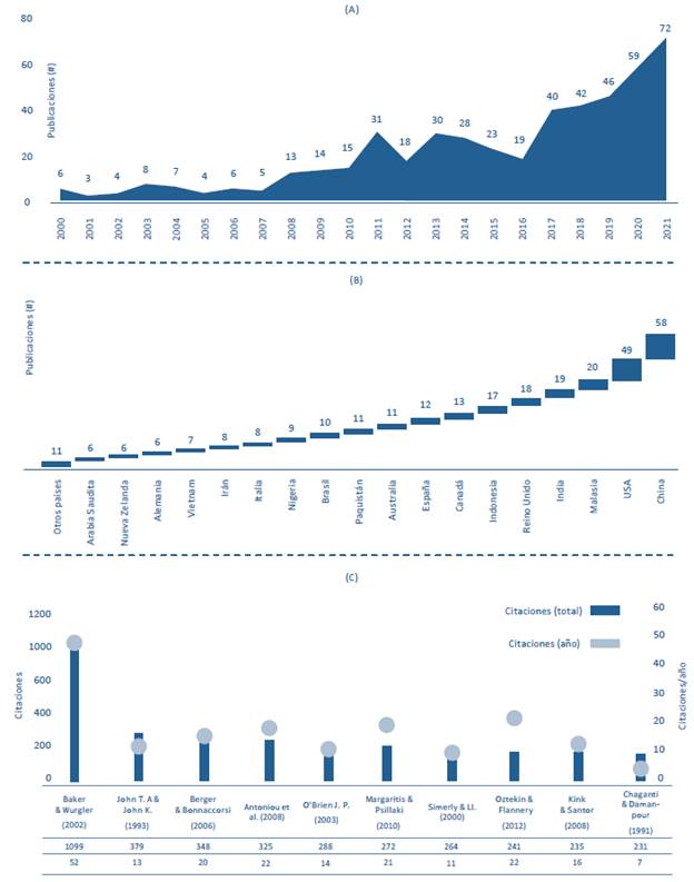 El análisis de la producción científica en estructura de capital realizado en este estudio con respecto al origen geográfico se muestra en la Figura 3.B. Este análisis es de gran interés por la visualización e identificación de focos geográficos de investigación y las regiones con aportes substanciales en este campo de estudio. En el periodo 2000-2021, China fue el foco geográfico más influyente en el tema de estructura de capital, superando con cerca del 16% a USA en número de publicaciones en 2021 (Figura 3.B).