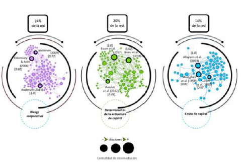Los clústeres riesgo corporativo, determinantes de la estructura de capital y costo del capital contienen aproximadamente el 58% de la totalidad de publicaciones y el 55% de las citaciones de la red extendida. Esto indica que la mayor proporción de publicaciones y citaciones, cifra superior al 50%, pudo ser discriminada en temáticas.