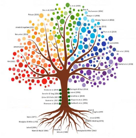 Además de las publicaciones más notorias, analizadas en este documento, también hacen parte del ToS sobre estructura de capital los artículos de Titman & Wessels, 1988, ubicados en la raíz, las publicaciones de Dierker et al. 2019; Borochin & Yang, 2016; Zeitun & Al Refai, 2017; Bhamra et al. 2010 y De Angelo & Stulz, 2014, ubicadas en el tronco y las publicaciones de Zeitsch, 2017; Palazzo, 2019; Dias et al. 2020; Li et al. 2019; Zhao & Huchzermeier, 2018; Wang et al. 2018; Gul & Cho, 2019; Pham et al. 2019; Joshi, 2018; Tahir et al. 2020; Martati et al. 2018 ubicadas en las hojas del Tree of Science, las cuales brindan su aporte a la red temática sobre estructura de capital, según su correspondiente ubicación.
