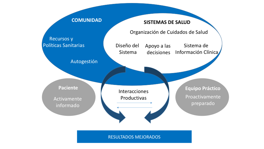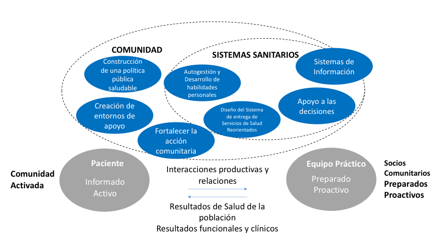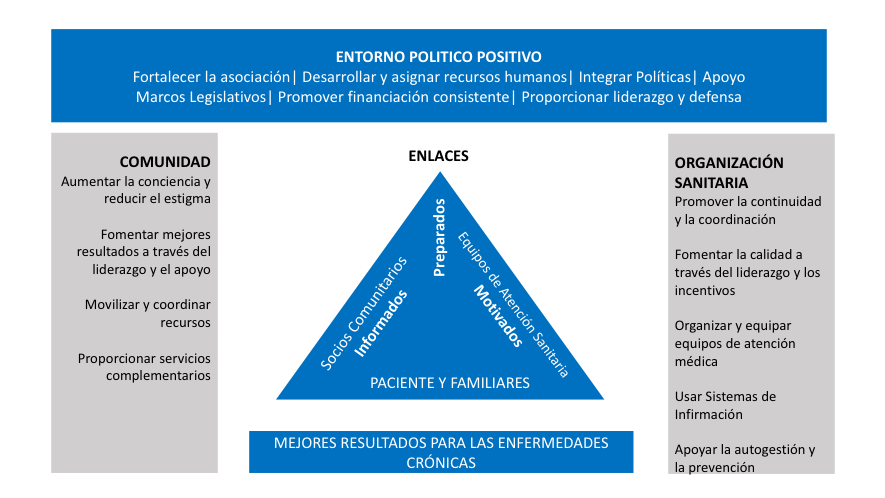 This innovative care of the WHO makes several key complementary contributions to the CCM and highlights the need for a unitary and strong health and social policy that can redirect the social health services, and orient them towards the real needs of patients with chronic pathologies, which is a key element of the model with a strong leadership and with collaboration, both interterritorial, as intersectoral. Hence, It provides a real integration of policies, financial sustainability, and trained and qualified human resources.