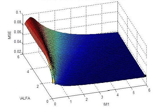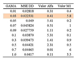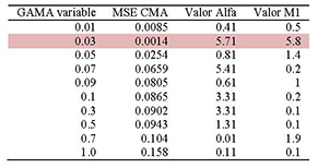 The blind channel equalization using the ARγ in the direct decision configuration was implemented by setting up a value for Gamma between 0.01 and 1 and variating the two adjustment parameters —i.e., Alpha and M1— in an interval between 0.01 and 6 with steps of 0.1. With this, we gathered a minimal squared error of 0.022331, with an Alpha value of 0.41 and M1 in 5.8. The results entail that for those Alpha, Gamma, and M1 values, a better estimation of the transmitted data and a considerable reduction of the squared error are obtained (see Table 2, Figure 2 and Figure 3).