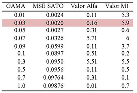 The second experiment was performed using the ARγ with statistics of the Sato algorithm by variating the Alpha, Gamma, and M1 setup parameters. We observed that for a Gamma value of 0.03, Alpha in 0.16, and M1 in 5.9, we obtained a minimal squared error of 0.0020. This result shows that with the use of the Sato statistics —which include the order 2 moments of the transmitted signal for the calculation of the error signal defining the new equalizer coefficients—, the data estimation is more optimum with a minimum squared error (see Table 3, Figure 4 and Figure 5).