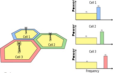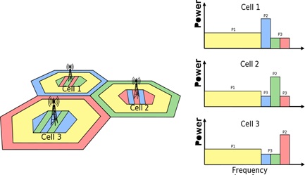 The UE in the center will receive the frequency fragments completely reused, whilst the UE in the edges will receive the orthogonal fragments. This means that the internal UE in a cell do not share any spectrum with the UE in the edges of the second cell, reducing the ICI (see Figure 3)