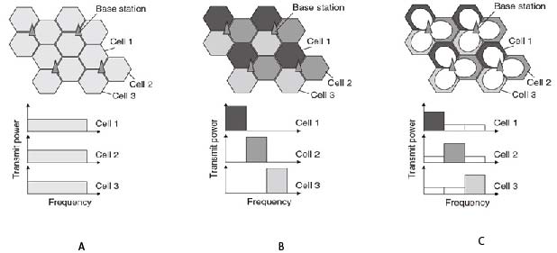 This scheme separates the allocated frequency bands to distant areas of a base station by fixing a frequency reuse of 3. For the central regions, the transmission power is reduced and a frequency reuse of 1 is applied (see Figure 2c). By doing this, it is possible to improve the Signal to Interference plus Noise Ratio [SINR] and the throughput for the UE in the cell edges. Some FFR schemes presented by Hamza et al., (2013)are described as follow: