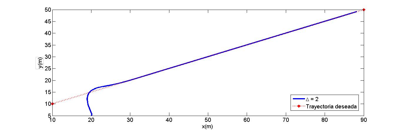 The Δ parameter is associated to the look-ahead distance, which is the distance existing between the projection of the vehicle position in the road and the point of the road where the boat goes. This parameter can be variable or constant and its selection is associated to the vehicle length —two to six times that length—. For the case of this research, we considered this value as constant.