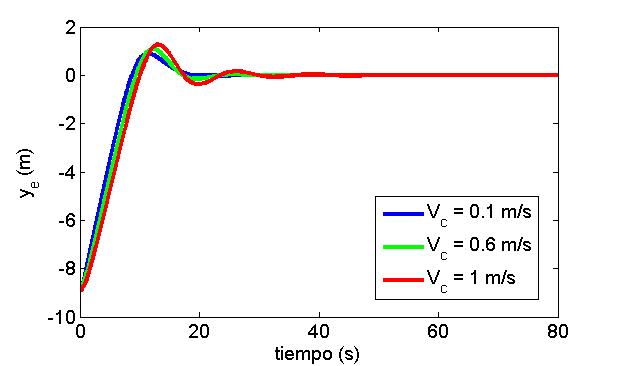 The set-up effectiveness is assessed via simulations by varying the sea currents speed influencing the vehicle. The objective of these tests is to demonstrate that the adjusted I-LOS controller can minimize the ye(t) error when several sea currents speeds are present. The simulations were performed under the same conditions described for the controller set-up by considering the speeds of the sea currents, [VC] as 0.1, 0.6,and1m⁄s, respectively.