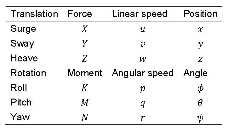 In Table 2 we present the standard nomenclature —SNAME notation (1950)— employed in the movement description of marine vehicles, where the yawing is the most important degree of freedom in the design of direction controllers.