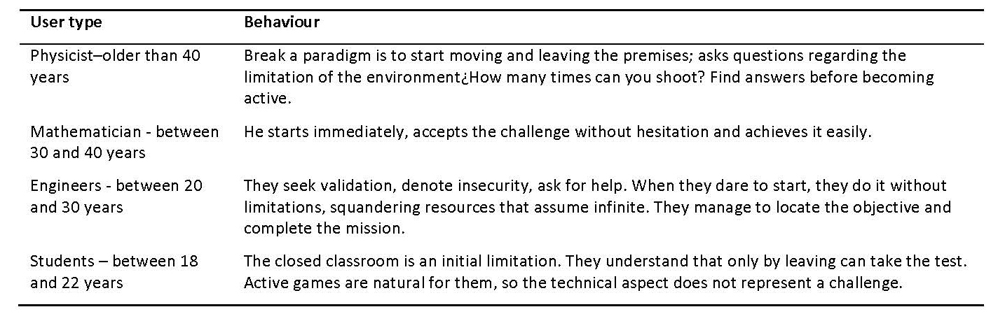 In the tests of autonomy,the need for support, guidance, advice, and clear guidelines are appreciated. The tests of Hunting are done in strict silence. They purposely “dived alone in the mud,” without aids or crutches. Just taking into account an initial instruction idea: “Download the application on your cell phone and do what it says”. Table 1 summarizes the behavior of each type of user.
