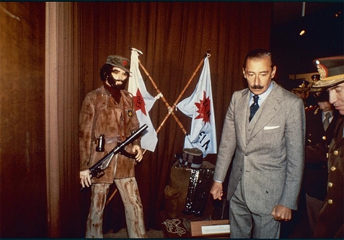 El salón estaba acondicionado dentro de una instalación. Era relativamente pequeño, el lugar. No minúsculo, pero pequeño. Tenía ese aire medio trucho, de puesta casi que escolar. De haber colgado unas cartulinas. Ahí estaba un poquito más emprolijado, pero era una versión no demasiado sofisticada. Estaba el maniquí ese ridículo. Ese Museo me da la sensación de que era una kermese. Me acuerdo que yo me apuré a sacar la foto junto a ese muñeco, cuando [Videla] se iba. Es parte del oficio: sabía que iba a pasar por ahí y entonces me apuré para mostrarlo con el muñeco ese. Para sacar una foto más ágil, que muestre algo.