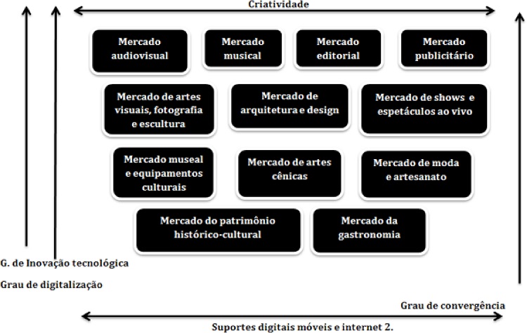 Há três aspectos estruturais que diferenciam os mercados culturais-digitais contemporâneos: i) o grau de inovação tecnológica; ii) o grau de digitalização; e iii) o grau de convergência digital. Cada mercado possui estágios muito distintos de digitalização. Os quatro mercados culturais-digitais, localizados no topo da Figura 1 (audiovisual, musical, editorial e publicitário), são os que possuem o maior grau de inovação tecnológica, maior grau de digitalização e o maior grau de convergência digital. Significa dizer que são os mercados que estão passando por uma intensa transição digital e, por conseguinte, de maior penetração dos serviços culturais-digitais. Os serviços culturais estão diretamente vinculados aos fluxos digitais e ao processo de desmaterialização, assim definido pela UNESCO. A desmaterialização consiste na digitalização dos conteúdos, principalmente os cinematográficos, musicais, editoriais e os jogos digitais. O conteúdo de um filme consumido em uma sala de cinema em um shopping center é classificado como o consumo de um bem cultural. Já a fruição desse mesmo filme nos dispositivos digitais móveis e fixos passa a constituir o consumo de um serviço cultural.