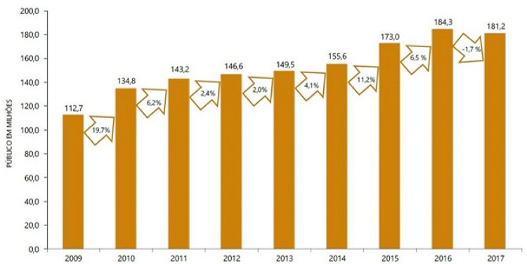 Embora o consumo das famílias e a renda per capita tenham registrado acentuadas quedas nos anos de 2014, 2015 e 2016, esses foram justamente os anos em que se constataram os maiores crescimentos na venda de ingressos para os cinemas brasileiros, que saiu de 155,6 milhões de ingressos vendidos, em 2014, para 173 milhões de ingressos comercializados em 2015, um crescimento de 17,4 milhões de ingressos em apenas um ano, o que significou uma elevação de 11%. Em 2016, o crescimento continuou, alcançando 184,3 milhões de ingressos vendidos. Embora em 2017 tenha ocorrido uma leve queda na comercialização de ingressos, recuando para 181,2 milhões (redução de 1,7%), essa redução ainda demonstra pouco impacto diante do acentuado arrefecimento constatado nos demais itens de consumo das famílias brasileiras.