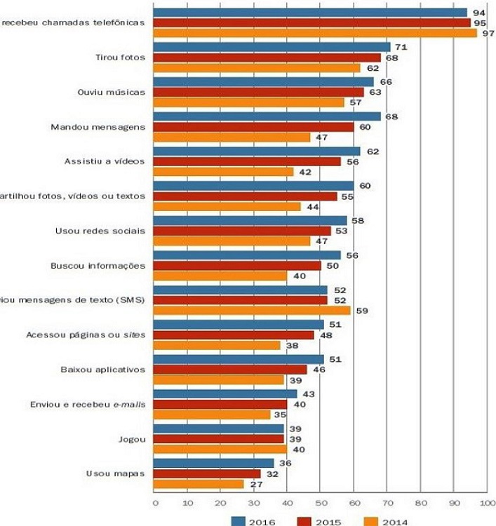 Em 2015, do total de usuários da internet no Brasil, 53% utilizaram exclusivamente o smartphone para consumir vídeos, programas, filmes, séries, fornecidos por empresas como a norte-americana Netflix. Por sua vez, 47% dos usuários de internet no Brasil acessaram a rede exclusivamente pelo aparelho celular, para ouvir conteúdos musicais on-line, fornecidos por empresas como Deezer, Spotify e Youtube. Em 2014, do total de usuários que utilizavam exclusivamente o smartphone para acessar a internet, 57% o fizeram para ouvir música, em 2016 esse percentual subiu para 66%. Em 2014, desse mesmo contingente de usuários que utilizaram exclusivamente o smartphone para acessar à internet, 42% o fizeram para assistir a vídeos, em 2016 esse percentual aumentou para 62%, um aumento de quase 50% em apenas dois anos (Gráfico 4).