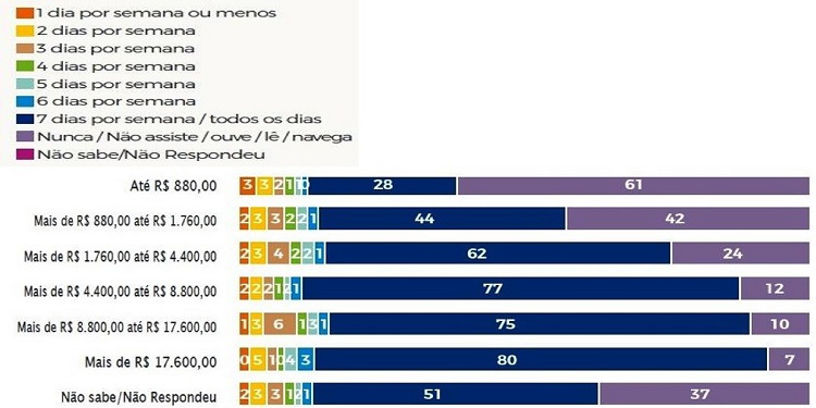 O aumento dos pacotes pós-pagos e a intensificação do consumo dos serviços culturais-digitais por parte das famílias se inscrevem no movimento mais amplo de recrudescimento e diferenciação dos usos da internet no Brasil. No entanto, esse movimento vem acompanhado da reprodução dos processos assimétricos e extremamente desiguais de distribuição dos recursos econômicos, simbólicos e educacionais existentes na sociedade brasileira. De acordo com a pesquisa encomendada pela SECOM, nada menos do que 62% dos estratos familiares que recebem entre R$ 1.670 e R$ 4.400 disseram acessar a internet todos os dias da semana; e 77% dos estratos familiares que recebem entre R$ 4.400 e 8.800 disseram que também acessam a internet todos os sete dias da semana, ininterruptamente. Por outro lado, 61% do estrato com renda familiar de até R$ 880 disse não acessar/navegar em dia algum. Esse percentual diminui de forma acentuada assim que se eleva a remuneração do estrato familiar. No caso dos domicílios que recebem entre R$ 880 e R$ 1.760, 42% disseram que não navegam/acessam de modo algum. Os não usuários, portanto, representam um contingente bastante significativo (Gráfico 5).